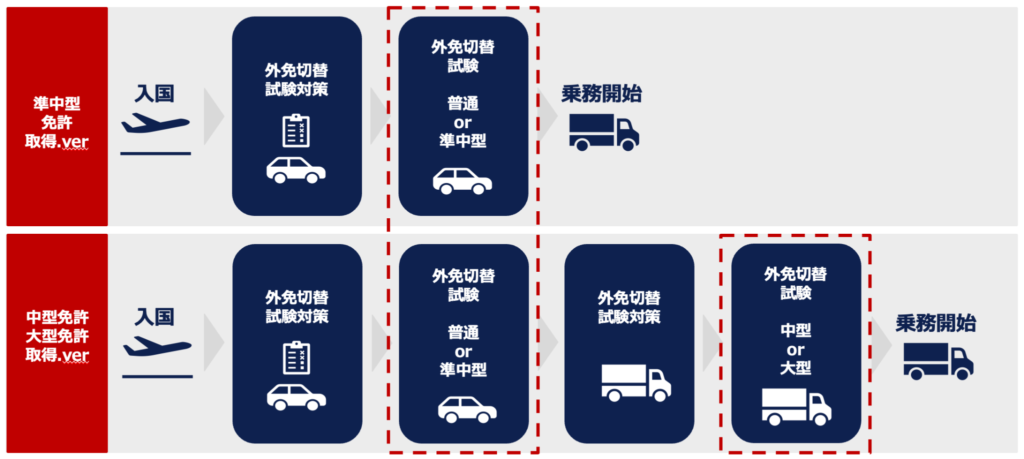 例えば、海外で大型免許相当の運転免許を所持していれば、日本でも大型免許まで切り替えることが可能です。ただし、はじめから大型免許に切り替えることはできません。まずは普通免許または準中型免許に切り替え、2回目の外免切替で中型免許または大型免許に切り替えることができます。