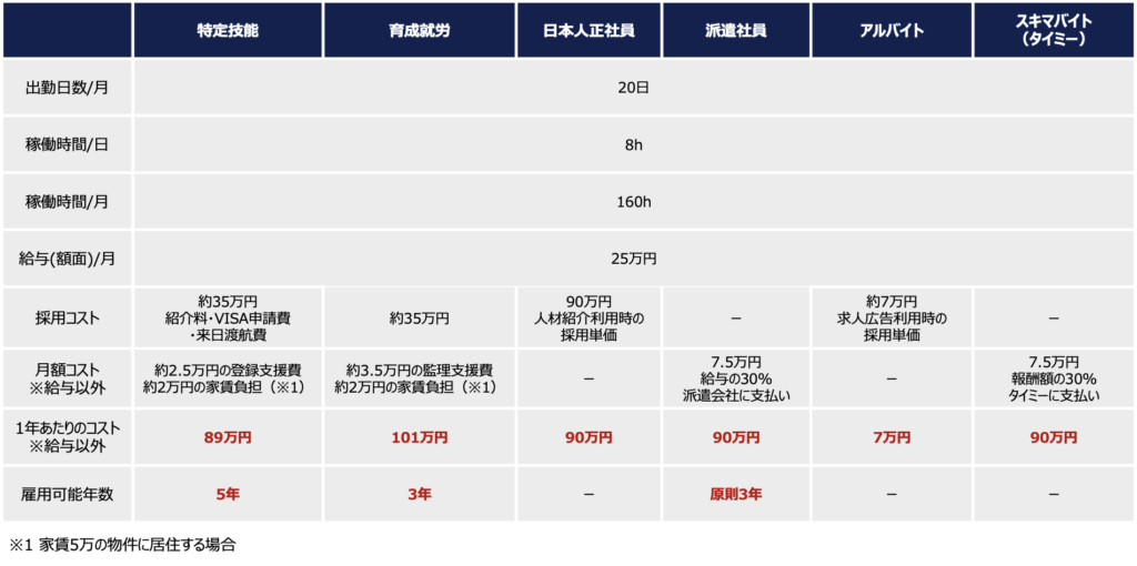 ・特定技能:登録支援機関への「登録支援費(約2.5万円/月)」が発生します。