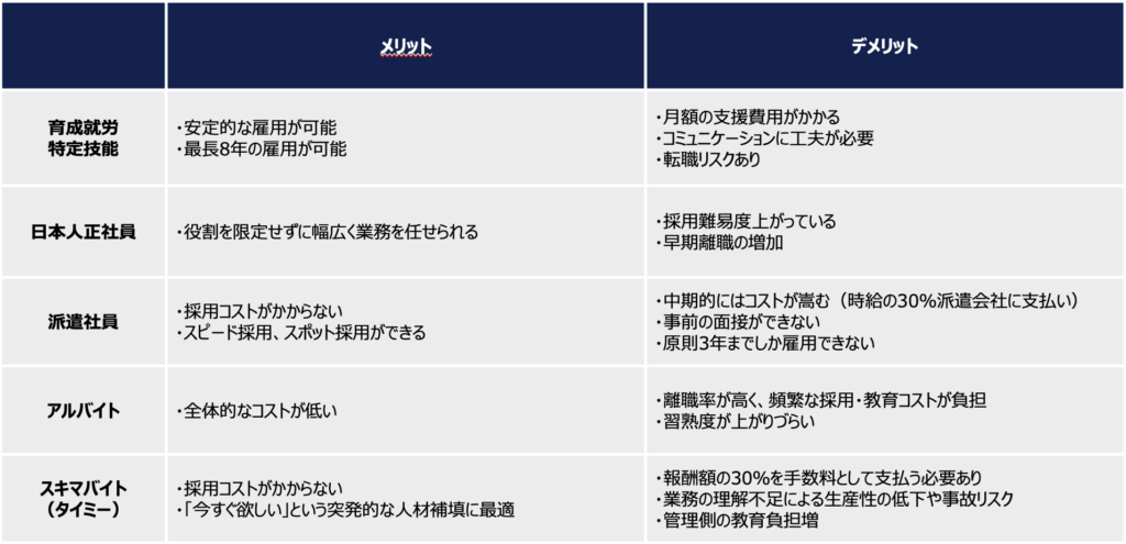 こうした背景を踏まえ、以下のニーズがある事業者様には「育成就労・特定技能」の活用が特におすすめです。