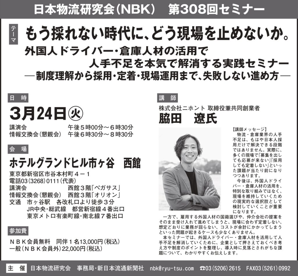「日本流通新聞」を発行する新日本流通新聞社主催のセミナー『第308回 日本物流研究会(NBK)』に弊社が登壇いたします。