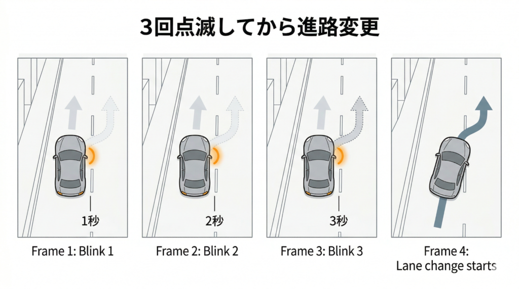 約1秒に1回点滅するため、3回点滅してから進路変更を始めると安定します。