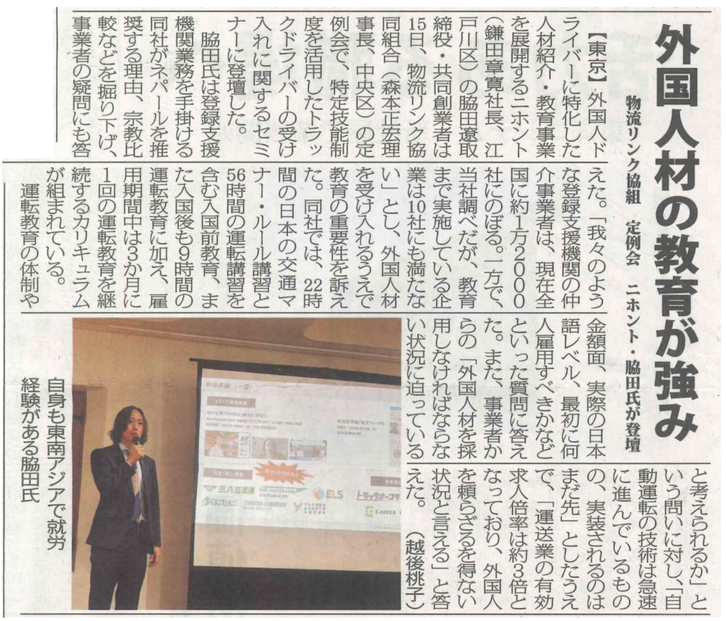 2026年4月15日(水)、物流リンク協同組合様主催のセミナーに弊社が登壇し、その様子を、物流・運送・トラック・倉庫・ロジスティクスの専門新聞「物流ウィークリー」にて、掲載いただきました。
